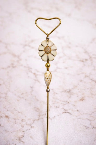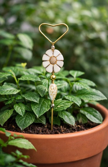 This delicate Daisy Heart Plant Pick features a gold-tone heart topper paired with a soft ivory daisy and elegant bead details, all anchored on a slim metal stake. It’s the perfect accent for houseplants, gift plants, or styled planters when you want something sweet but not over-the-top.