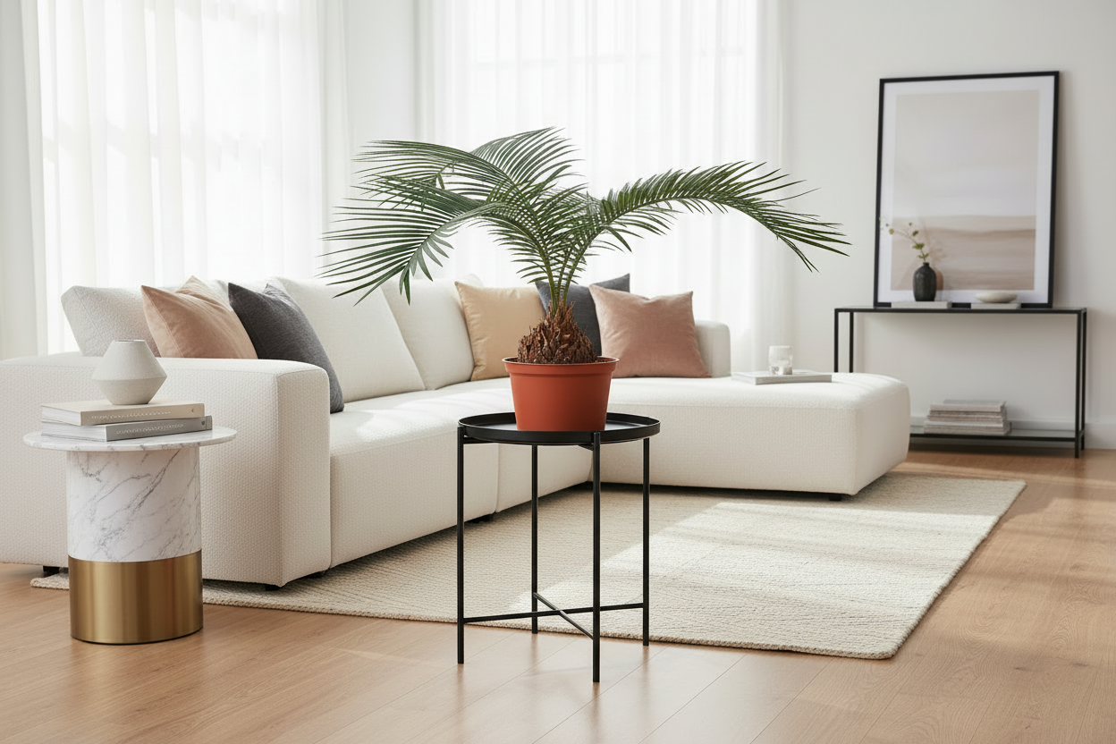 Maintenance: Remove older, yellowing fronds at the base to maintain its neat, symmetrical look.